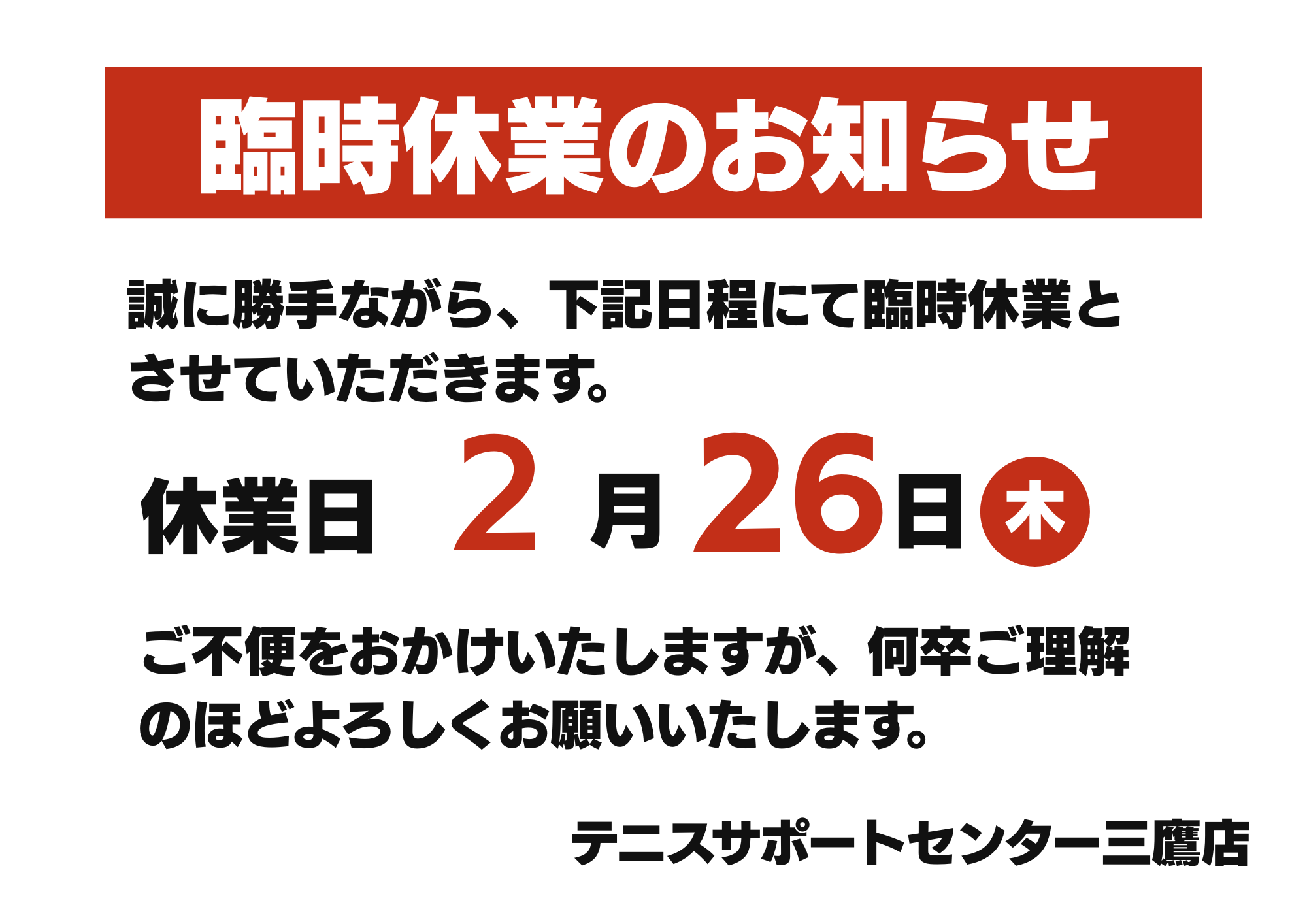2月26日(木)は棚卸作業のため、